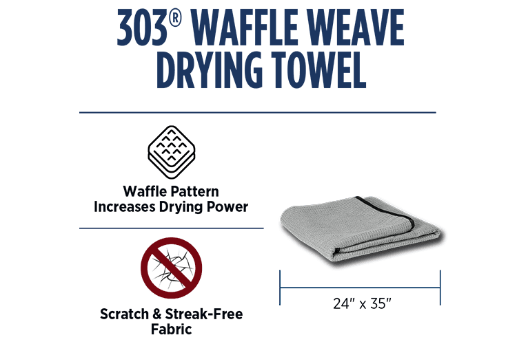 Är du trött på att använda flera mikrofiberdukar för att torka din bil, lastbil eller SUV? Då behöver du inte leta längre än 303® våffelvävd torkduk! Våffelväven ger en större yta än din vanliga mikrofiber, vilket ger dig rätt verktyg för att torka ditt fordon, repfritt och ränderfritt.